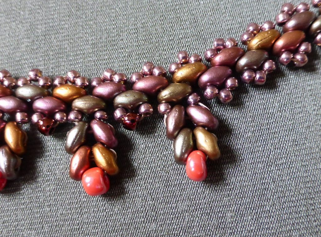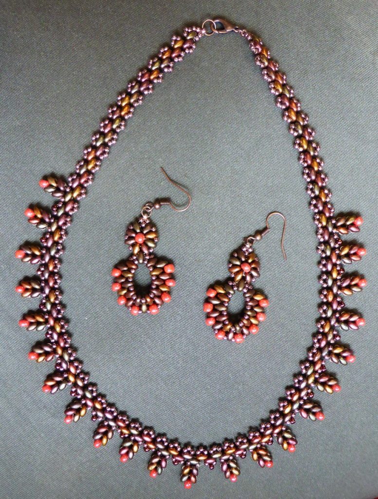 Na ukrasnim ’visuljcima’ od 4 SuperDuo perlice sam koristila koralne perlice iste kao na minđušama, a između njih zrnaste bronzane perlice 8/0. Mislim da bi bilo još lepše da sam imala viseće ili 8/0 perlice iste takve koralne boje, ali nisam ih imala. A bila sam tako nestrpljiva da napravim ovu ogrlicu.