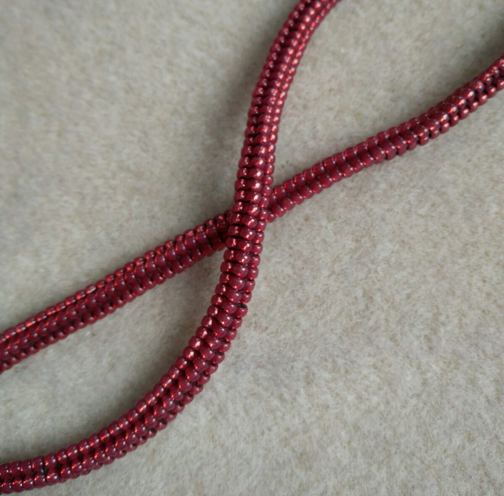 Konac koji sam koristila je crni Wildfire 0.15 mm. Mada se konac skoro ne vidi među perlicama, veoma je teško kod ovakvog rada sakriti kraj konca tako da se ne vidi. Pošto je gajtan kružni, tj. sastoji se od redova od 4 perlice povezane u krug, teško možete odrediti šta će mu biti naličje, pa da tamo sakrijete konac.