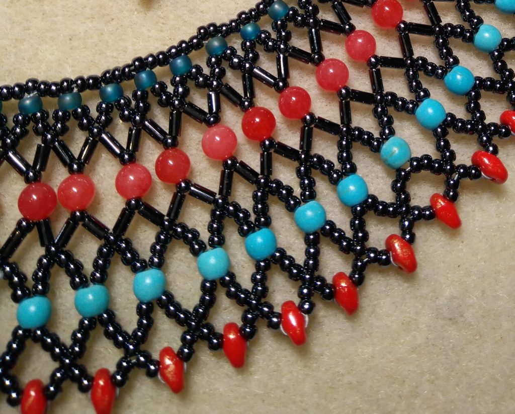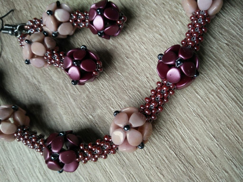 Tehnika nastavljanja konca mi je mnogo više koristila kada sam radila komplet ’Poppy’, po dizajnu i tutorijalu Swetlane Rohloff. U ovom fantastičnom projektu se koristi peyote i herringbone tehnika sa perlicama veličine 11/0, 15/0 i cilindričnim 11/0 perlicama. Koristila sam crni Fireline konac debljine 0.10mm i crveni Fireline debljine 0.12mm. Konce sam nastavljala isključivo tehnikom stapanja. Čvorići su prolazili čak i kroz najsitnije 15/0 perlice, mada se moram ograditi, te perlice su bile Toho. Nisam sigurna da bi uspelo i sa Miyuki 15/0 perlicama.