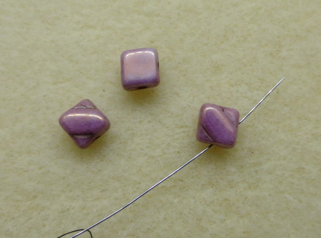 Ovo su perlice od presovanog stakla koje se prave u Češkoj. Kvadratnog su oblika, dimenzije su 6x6mm, a debljina im je nešto manje od 4mm. Sa jedne strane po dijagonali imaju malo zadebljan deo, to je lice perlice, a na naličju su sasvim ravne. Dve rupe su probušene paralelno sa dijagonalom sa obe strane.
